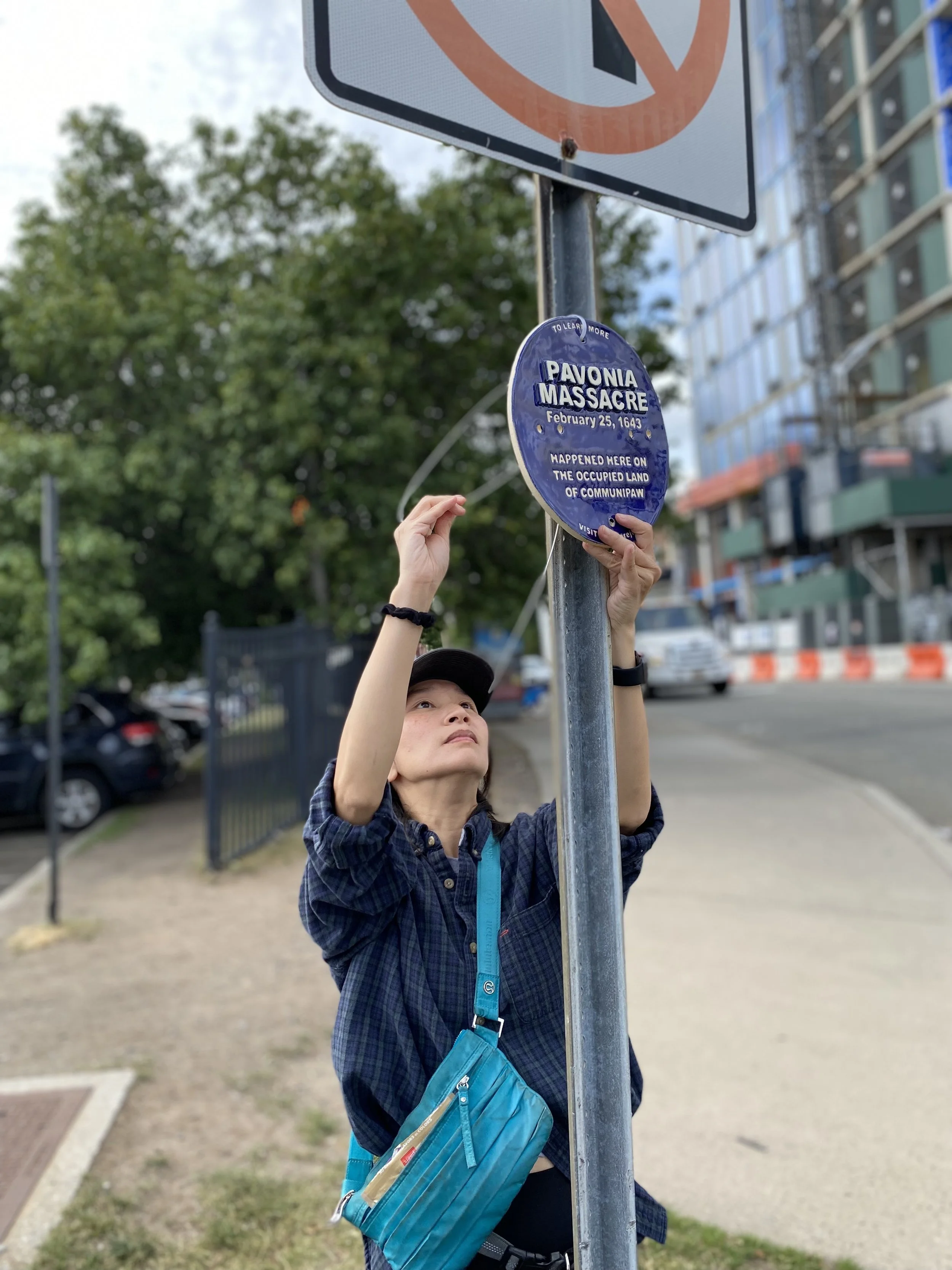 Jin Jung: I always saw those blue plaques as a temporary solution. I thought that it wasn't my job to place a permanent marker, that I am an artist and I am not a city official or someone with more means to maintain something. Currently, I have to go around town, like with all the tools in my hands and make sure things are still tied up.